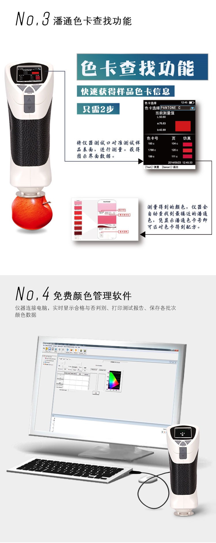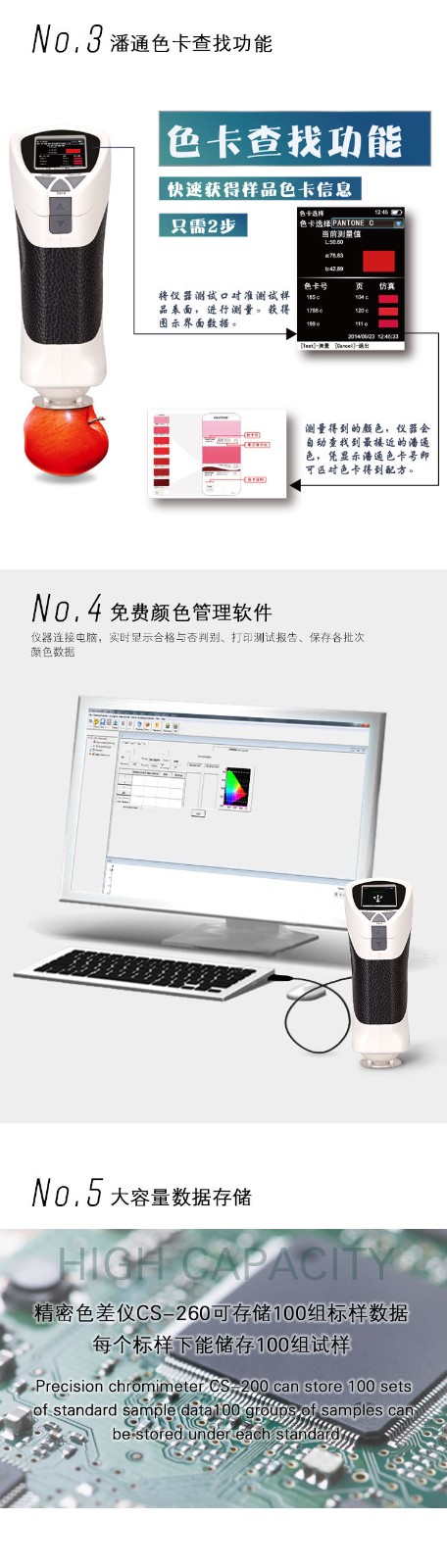 CS-260潘通色卡讀數(shù)儀能讀取樣板顏色并能顯示zui相近的潘通色卡號(hào),廣泛應(yīng)用于塑膠、印刷、油漆油墨、紡織、印染服裝等行業(yè)的顏色管理*域,根據(jù)CIE色空間測量樣品色值L*a*b、L*c*h,與被測樣品的色差△E以及 △Lab值。