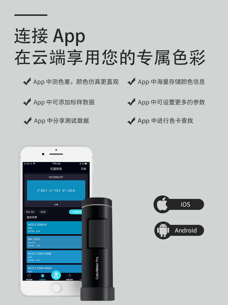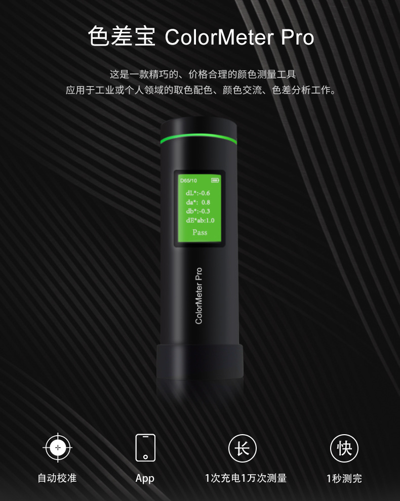 色差寶ColorMeter Pro是一款不同以往的顏色工具,強(qiáng)大的性能配置,讓色彩測(cè)量更專業(yè);與安卓或IOS設(shè)備無(wú)線連接,極大的拓展了顏色測(cè)量?jī)x器的應(yīng)用邊界;它將帶您進(jìn)入色彩管理新世界,可替代印刷、涂料、紡織等色卡,實(shí)現(xiàn)顏色讀取、色卡查找功能。