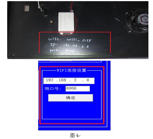 如果是第一次調(diào)試或使用軟件,建議檢查WIFI的IP地址和端口號設(shè)置是否正確,在“系統(tǒng)設(shè)置”對話框內(nèi),有“WIFI連接設(shè)置”項(xiàng),框內(nèi)有IP和端口號的信息,在設(shè)備的前面板打開后,有此車轍儀的相關(guān)信息(見圖4),如果對應(yīng)就是設(shè)置正確。